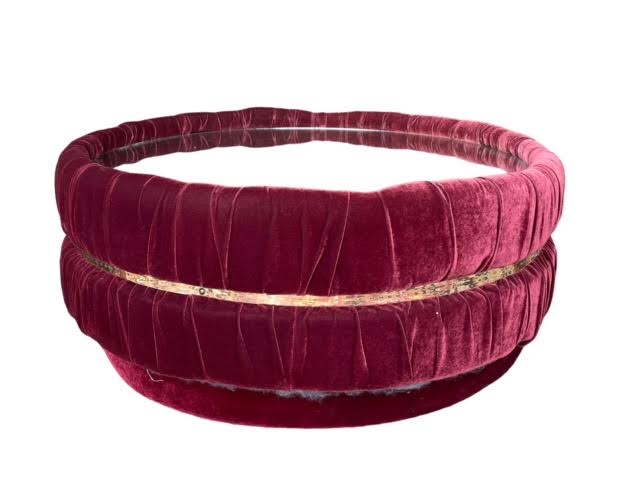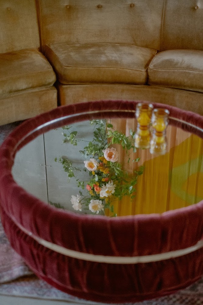 Description: A statement coffee table! Burgundy velvet with gold trim and a mirrored top. And it swivels! Funky and vintage!