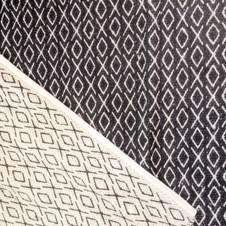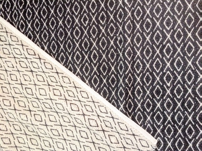 Description: A modern, black & white rug with a geometric pattern. And it's reversible! Choose the black or white side. Great for a modern, boho or vintage lounge look.