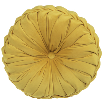 Description: A gold, velvet round pillow with a tufted center and a folded edge.