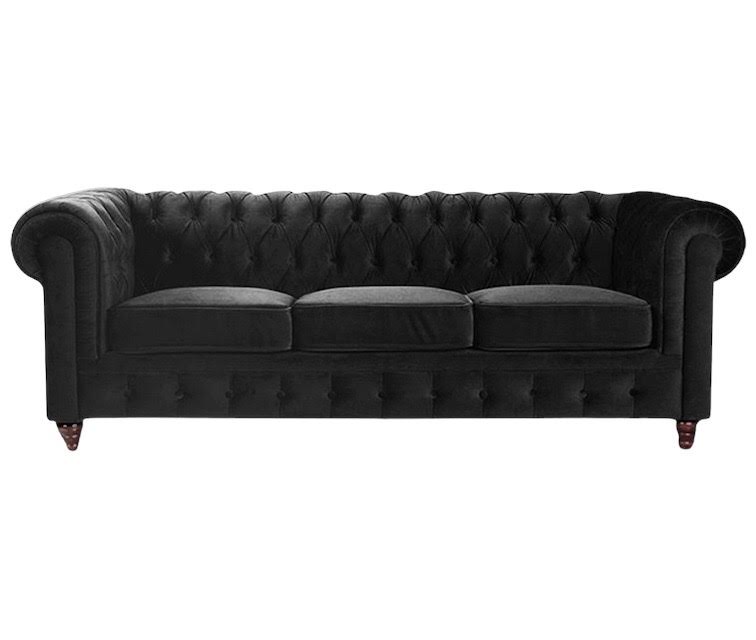 Description: A black velvet chesterfield, modern and elegant. It coordinates well with vintage furniture for a true vintage meets modern look!
