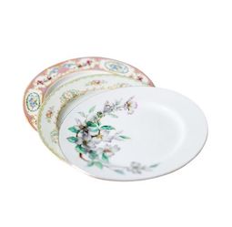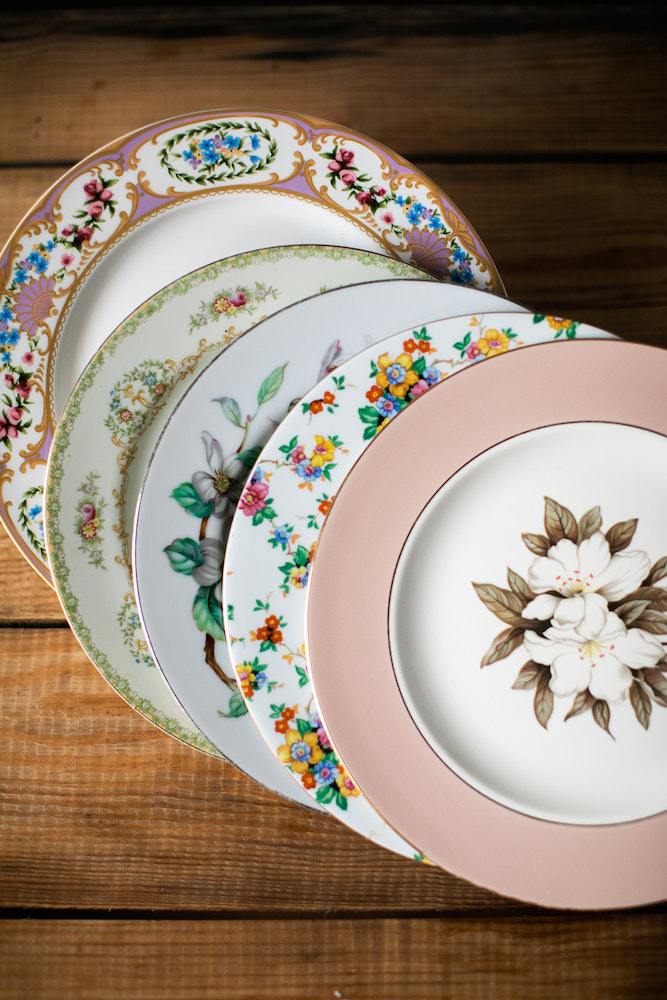 Description: Mismatched china dinner plates in a variety of colors and patterns, many of them floral, pastel, and with gold or silver rims. They are generally 10-12" in diameter and suit any style - romantic, elegant, boho, etc... Rented by the piece. Specify quantity desired.