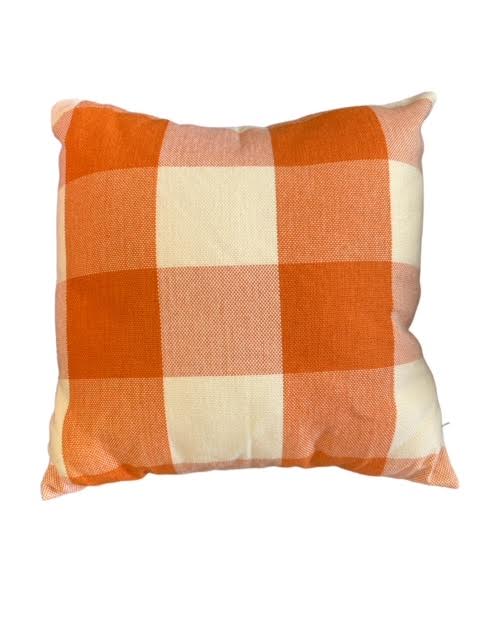 Description: An outdoor pillow in orange and white plaid with a country vibe.