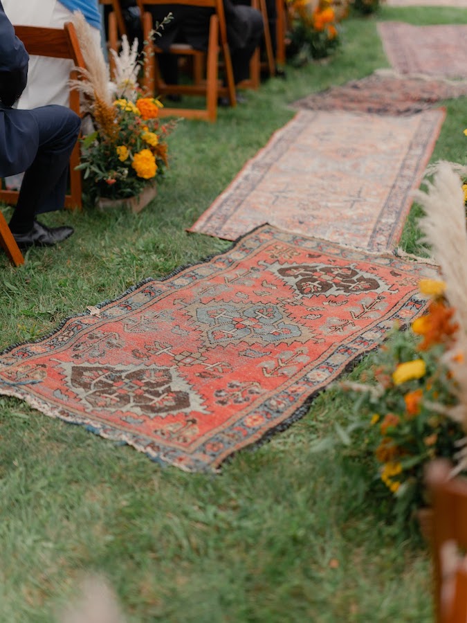 Description: The perfect accent rug in orange and warm tones for your ceremony aisle or vignette.