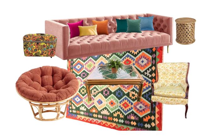 Description: A bright, colorful lounge package with a groovy 60s vibe, inspired by Cosmic Thing by The B52s. Retro suitcase included. Plant not included.