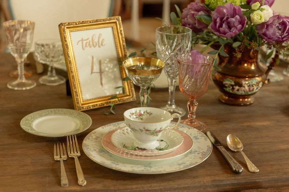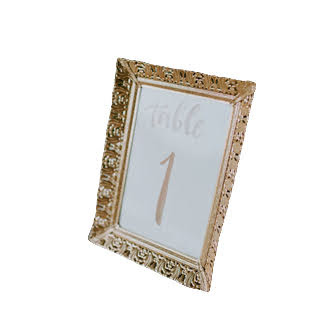 Description: Custom made from assorted vintage frames and elegant calligraphy in rose gold, these table numbers stand out! Pair them with gold or rose gold/copper flatware for a gorgeous tablescape. Rented by the piece. Specify quantity desired.
