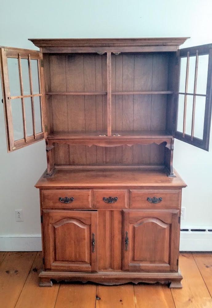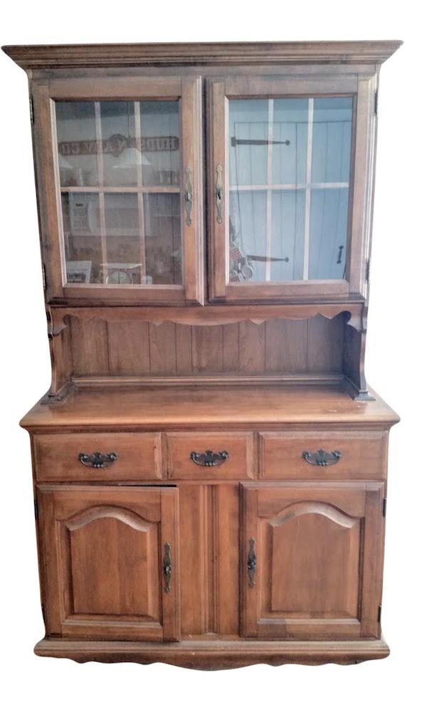 Description: A brown, wooden hutch with glass doors. Use in the kitchen of a home staging project or to prop up a wedding or event. Perfect for a general store or candy store vibe, coffee bar, or favor display.