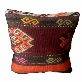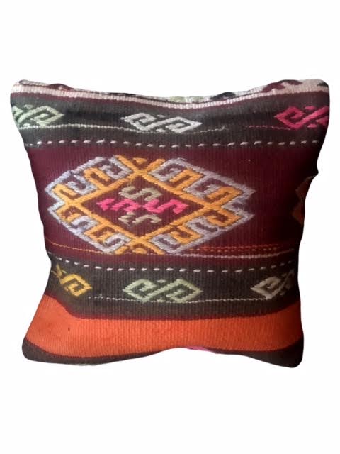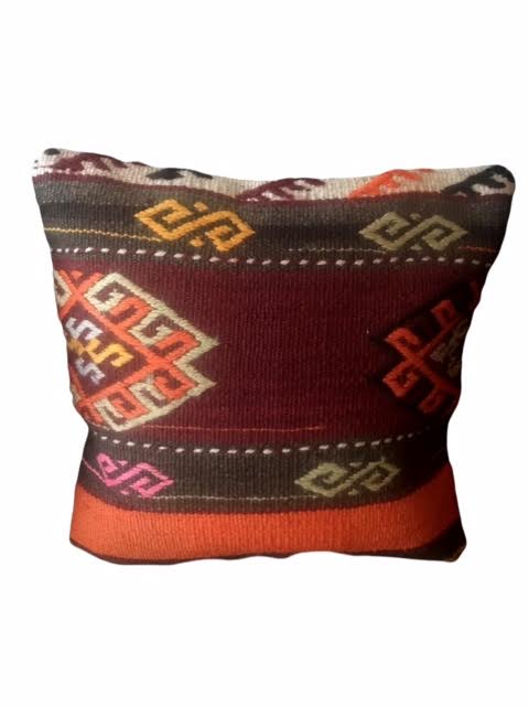 Description: A pair of coordinating kilim pillows in burgundy, bright orange, brown & pink.