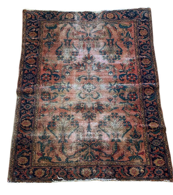Description: This vintage rug is worn in all the right places. Add it to your event lounge, wedding ceremony, or home staging project.