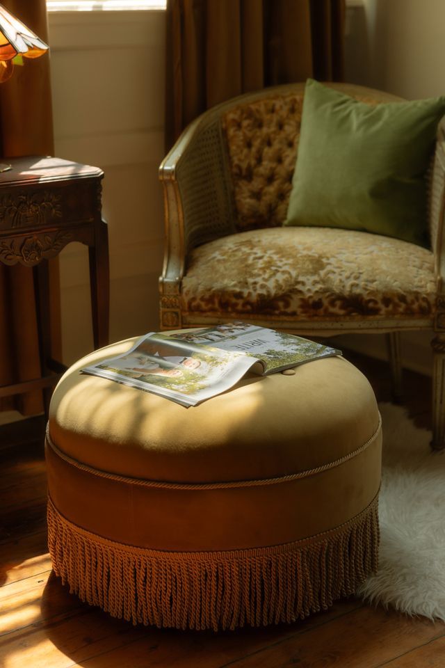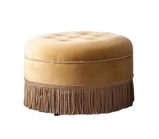 Description: A stylish, vintage chic, gold fringed ottoman to use as a footrest or additional seating. Or pop a tray on top to create an accent table for your lounge.