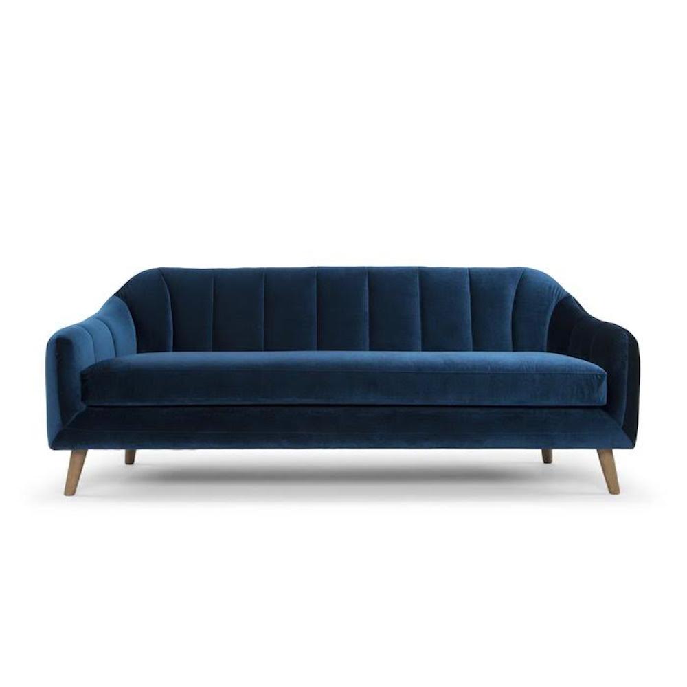 Description: A modern, bold, blue velvet sofa, sure to elevate your lounge and wow your guests!