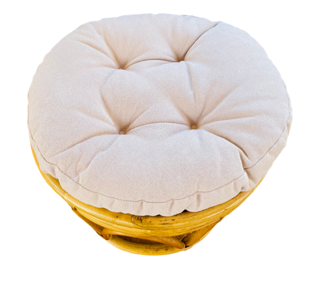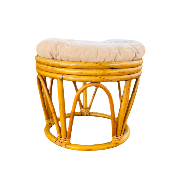 Description: A bamboo ottoman topped with your choice of beige or orange cushion.