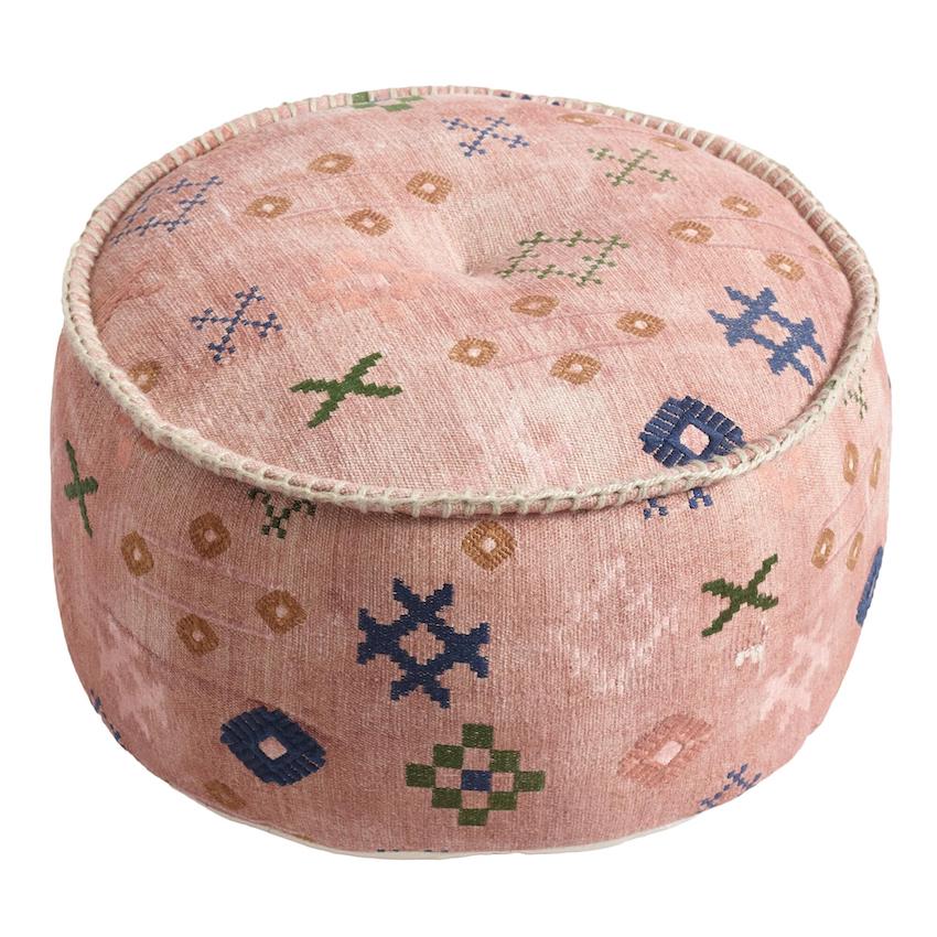 Description: A round, dusty rose pouf with abstract symbols. A stylish addition to any modern or boho lounge.