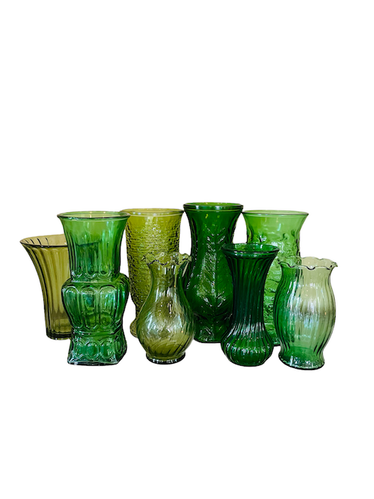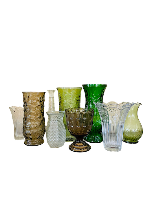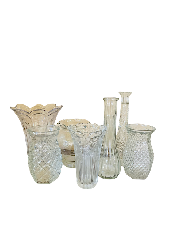 Description: Assorted glass vases in clear and a variety of colors. Specify clear or ask about colored options. Rented by the piece. Specify quantity desired.