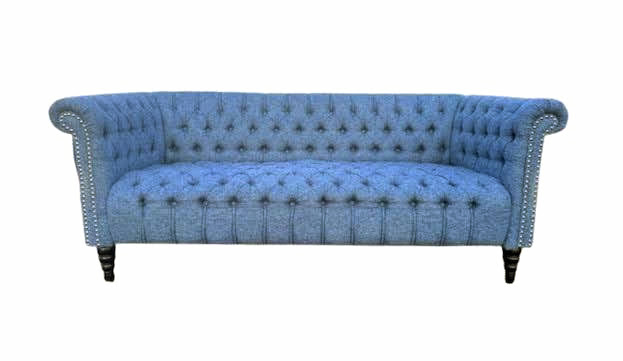 Description: A small, tuxedo sofa in a blue denim-like fabric with nailhead trim. A great addition to an event lounge or home staging project.