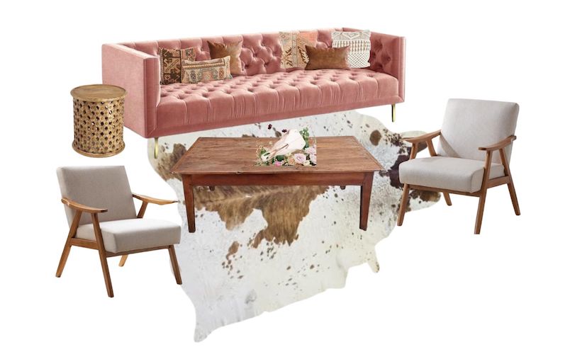 Description: A country western lounge package in pink and neutrals, inspired by Miranda Lambert's Four The Record album. Skull included. Flowers not included.
