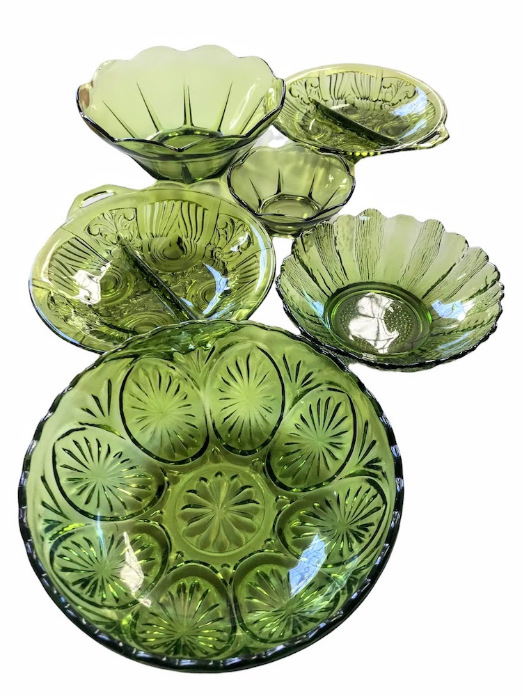 Description: Assorted small green glass dishes are ideal for candy dishes, bar garnishes, or for spreads, etc... on the harvest table. These green ones are retro looking too and coordinate with our green glass lazy susan. Rented by the piece. Specify quantity desired.