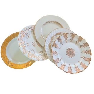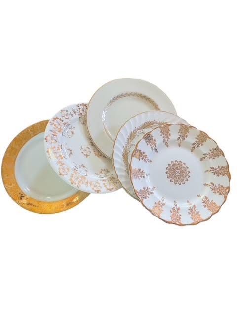 Description: Mismatched gold and white china consisting of white and cream dishes with a variety of gold details. Use for bread and butter, charcuterie, and for cake! Rented by the piece. Specify quantity desired.