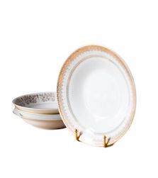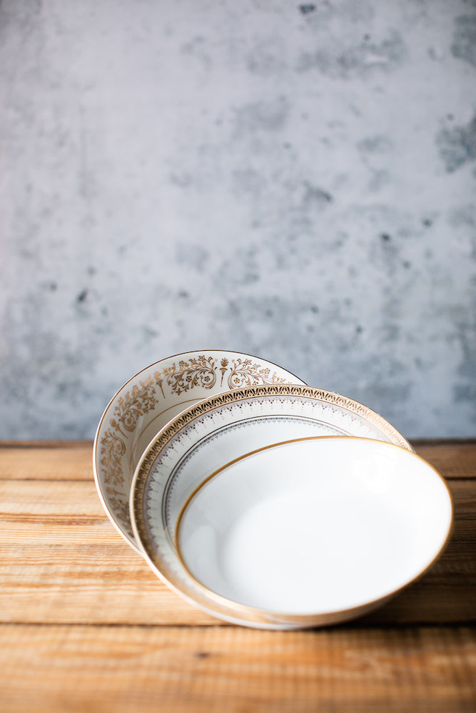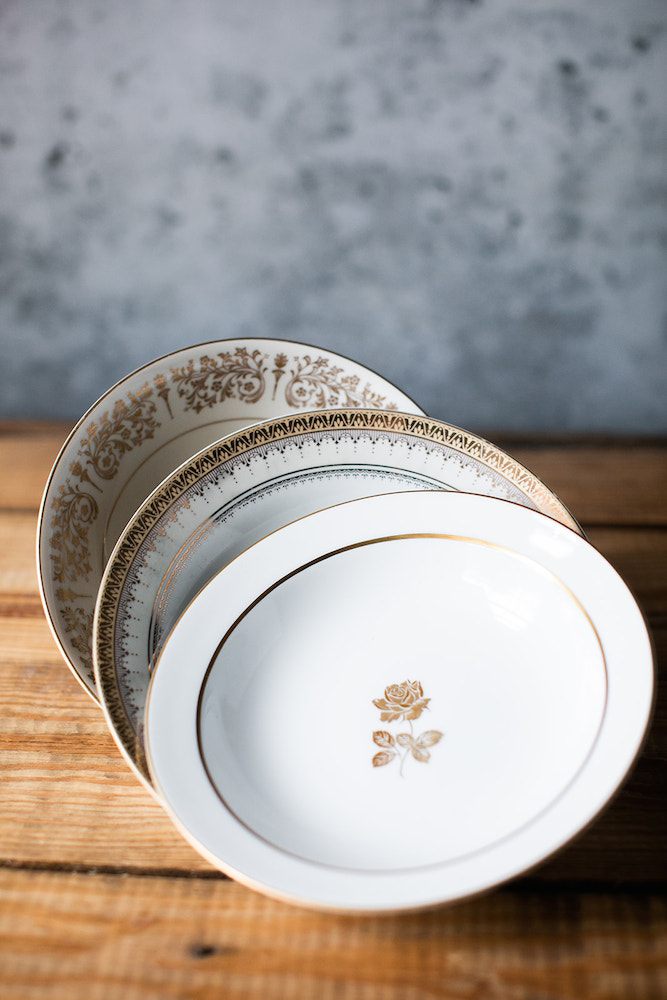 Description: Mismatched gold and white china consisting of white and cream dishes with a variety of gold details. Use for soup, pasta, or vegetarian/vegan option. Rented by the piece. Specify quantity desired.