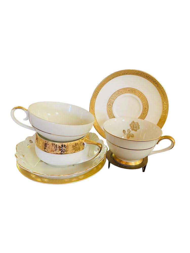 Description: Mismatched gold trimmed consisting of white and cream dishes with a variety of gold details. Incorporate these into your table settings or display on a coffee and tea bar. Specify the quantity of cup & saucer sets desired.