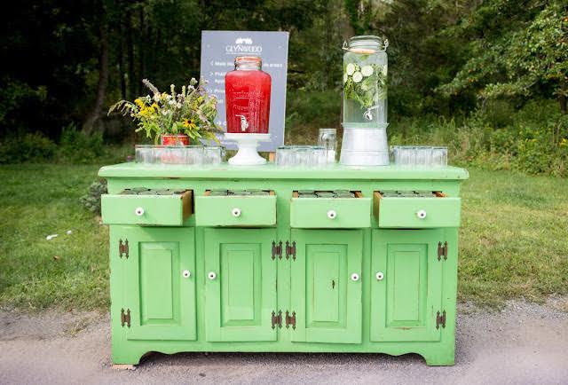 Description: A vintage sideboard with a pop of color. This is a bold, rustic option for a welcome table, specialty bar, dessert display, or for favors and gifts. It's also a statement piece for a home staging project!