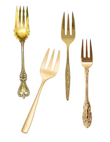 Description: Mismatched gold serving forks for your family style meal or buffet. They coordinate with our Vintage Gold Flatware collection. Rented by the piece. Specify quantity desired.