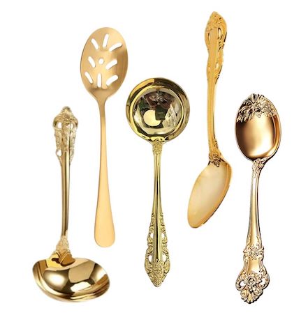 Description: Mismatched gold serving spoons for your family style meal or buffet. They coordinate perfectly with our Vintage Gold Flatware collection. Rented by the piece. Specify quantity desired.