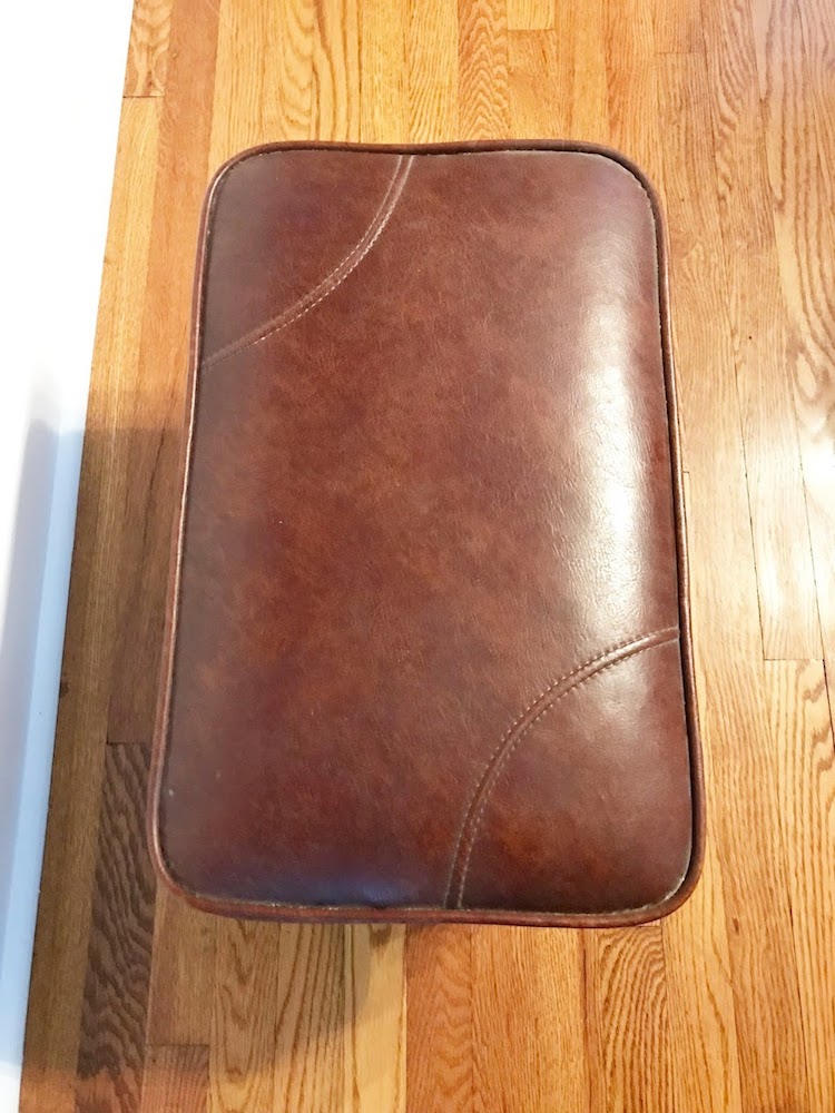 Description: A little, retro, brown leather ottoman. Add it to your 70's lounge for a footrest or a bit more seating.