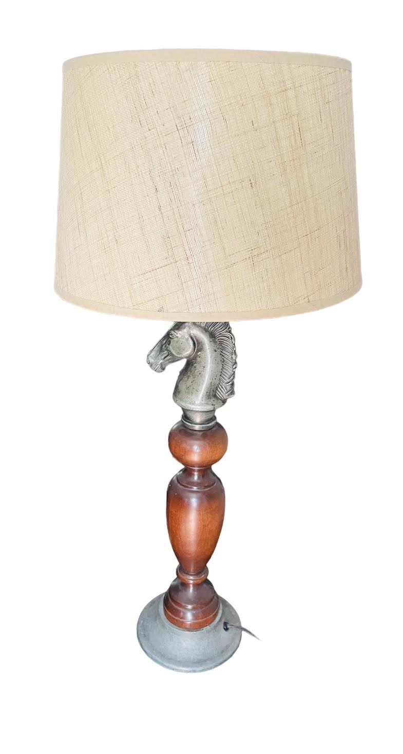 Description: A vintage lamp with wooden base, metal horse head and neutral shade.