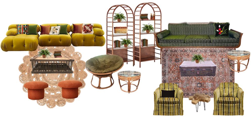 Tags: gold, lounge, low seating, home staging, vintage meets modern, cocktail hour, earthy, green, halloween, woodland, harry potter, living room, lounge packages, after party, fun