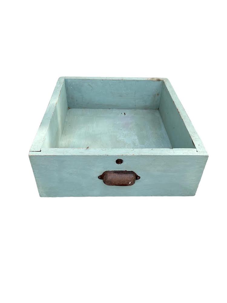 Description: A small wooden drawer, painted light blue. Prop it up on a table or bar to display napkins, programs, or favors.