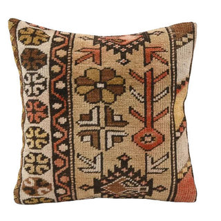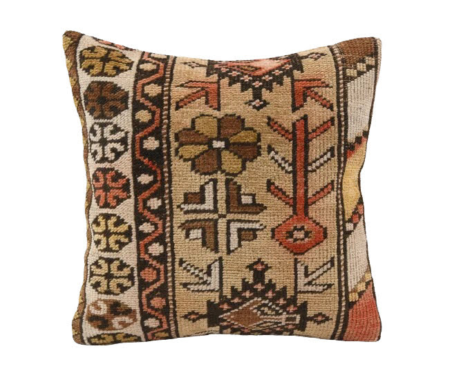 Description: A Turkish kilim pillow in beige, brown and red.