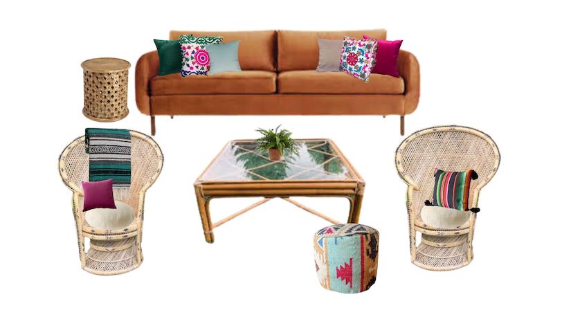 Description: A colorful lounge package with a Mexican vibe, inspired by the La Bamba movie soundtrack. Pillows and blanket included. Plant not included.