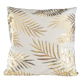 Description: A white pillow with gold tropical palm print. For an elegant tropical vibe.