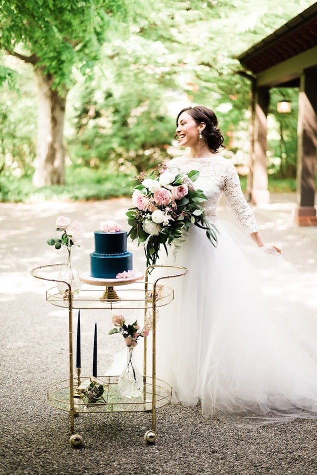 Description: A vintage gold bar cart with personality. It makes a glamorous wedding cake display or lounge accent table.