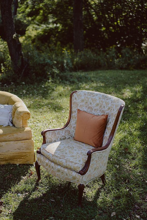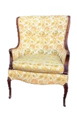 Description: A vintage, yellow floral print chair with gorgeous dark wood trim.