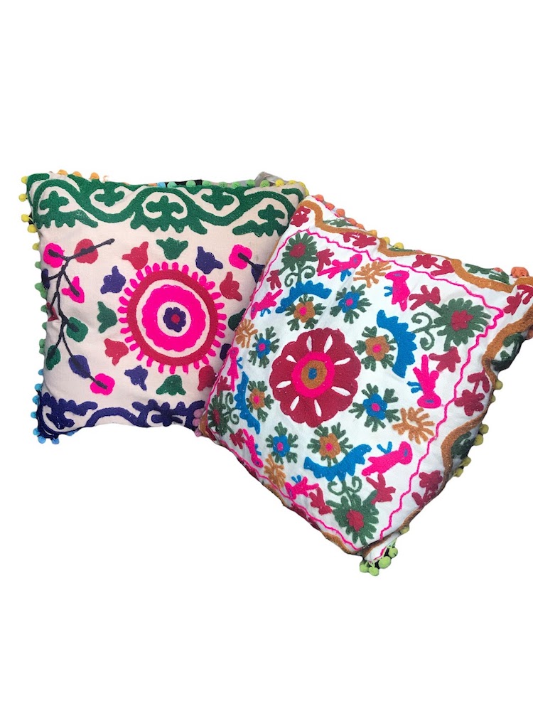 Description: A pair of bright, multi-colored Mexican embroidered pillows.