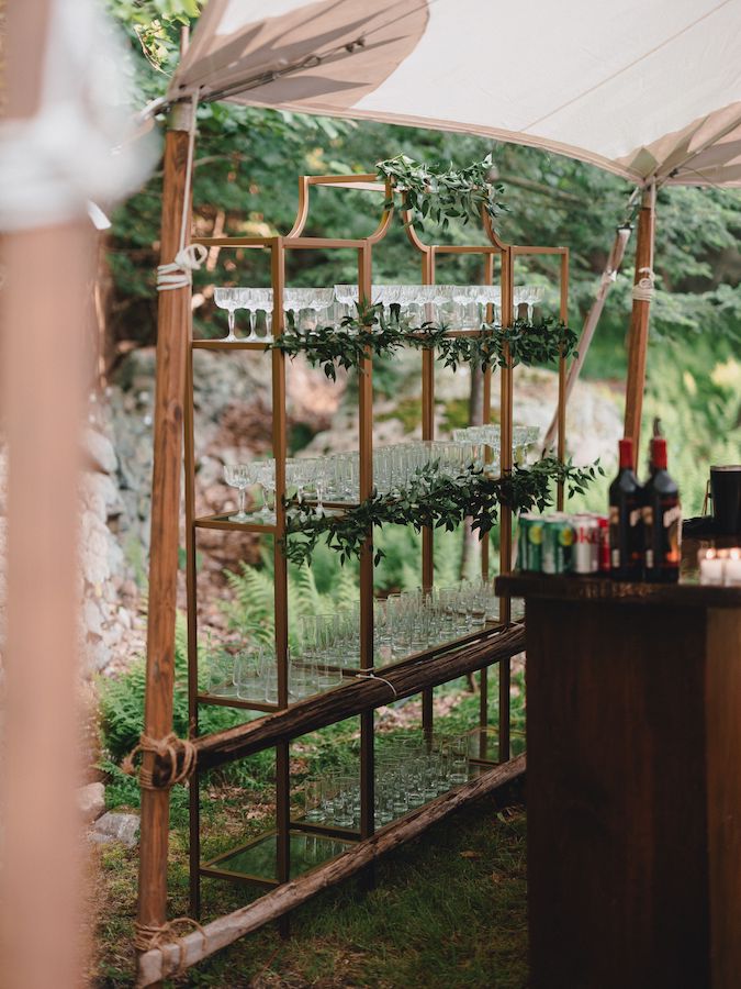 Description: A gold and glass shelving unit and lovely display piece. Use for a back bar, welcome drinks, favors, and more!