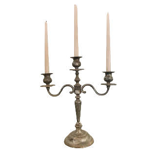 Description: A tall, silver candelabra with 3 candle holders. It coordinates well with assorted silver and pewter candlesticks. It would make a stunning centerpiece or prop for a mantle. Candles not included.