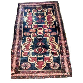Description: With plum, red, black, and white, this vintage rug will add warmth to your ceremony, lounge, or vignette.