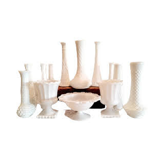 Description: Assorted milk glass vessels add so much charm to a tablescape, whether your look is simple/minimalist or vintage "Grandma." We love using the bud vases for florals as well as candles. Rented by the piece. Specify quantity desired.