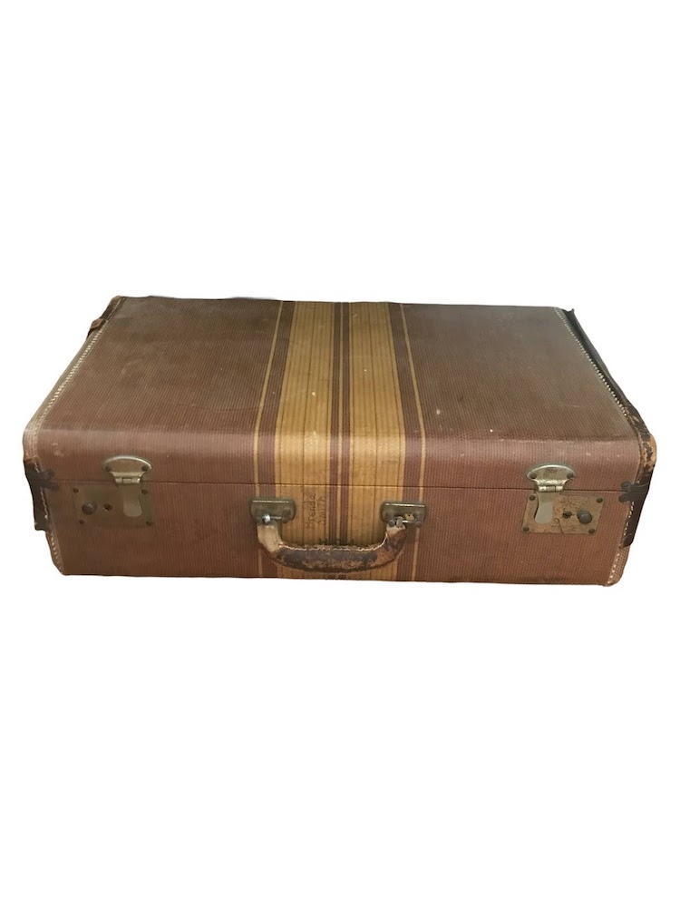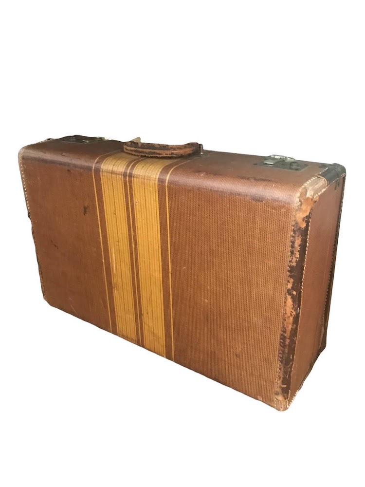 Description: A vintage brown suitcase with a variety of uses. Use as a vessel for programs, cards, or favors. Create an end table, or use as a prop.