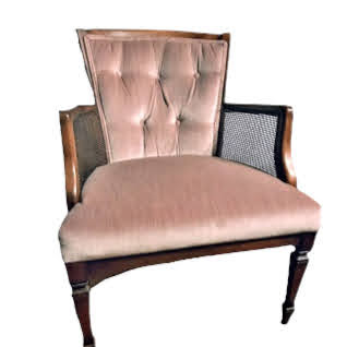 Description: A vintage chair with caning and velvet upholstery. It's neutral blush hue will add beauty to any seating area.
