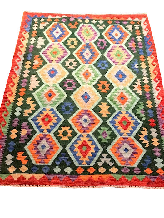 Description: A stunning hand made Afghani Miamana Kilim Area Rug, 100% Wool and dyed with natural dyes. Incredible vibrant colors, orange border with intricate triangle design throughout in dark and pale greens, with cream and blue accents.