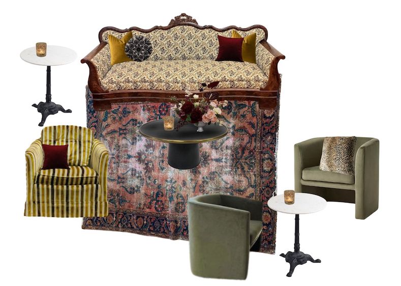 Description: A boho lounge in jewel tones inspired by Janis Joplin's Pearl album. Floral centerpiece and candles not included.