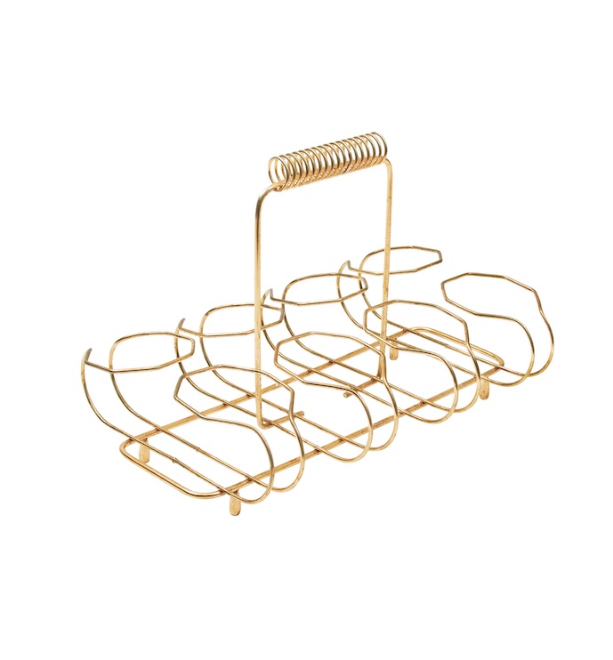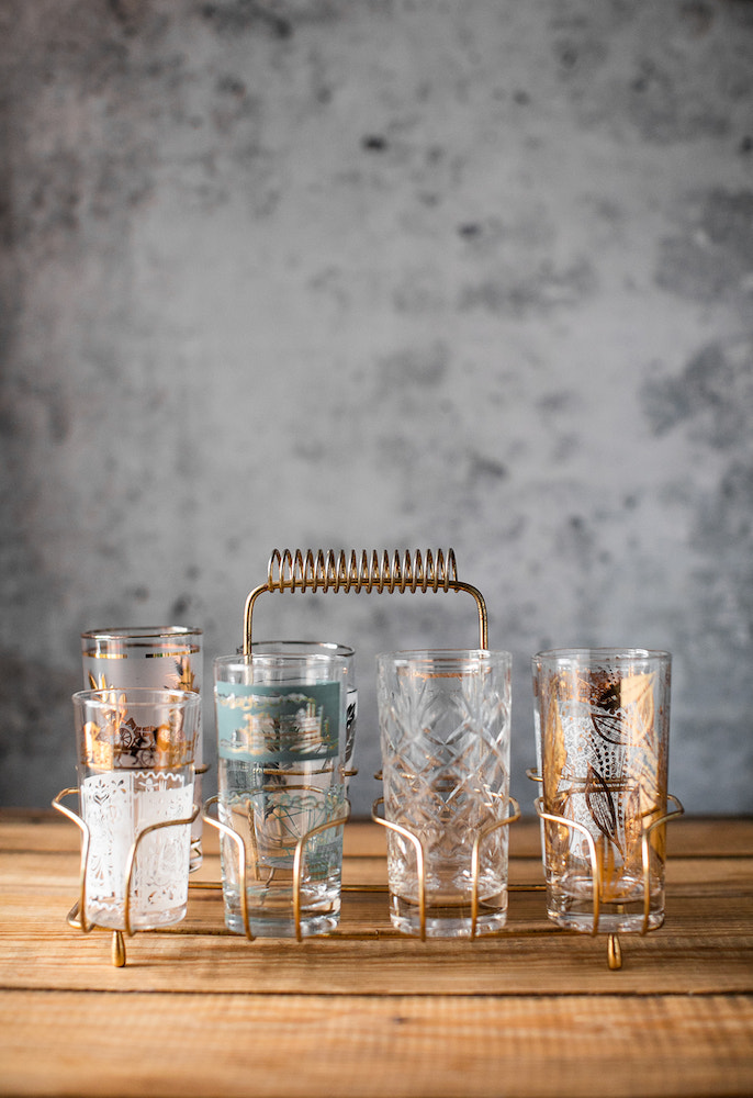 Description: A vintage gold caddy to display your vintage glassware. Set atop your bar or bar cart to display a sample of the beautiful glassware you've sourced for your event.