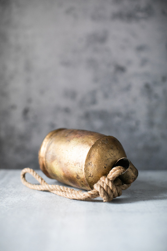 Description: A bell in rustic brass finish with a wooden clapper. Hang it near an entrance or from a tree. It comes with a thick rope hanger.