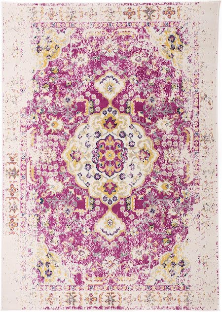 Description: A small distressed rug in pink and white with gray and pops of gold. Consider for the ceremony aisle, entry or kid's room.
