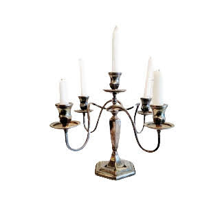 Description: A beautiful silver candelabra that coordinates well with assorted silver and pewter candlesticks. It would make a stunning centerpiece for a sweetheart table with vintage china and silverware. Candles not included.