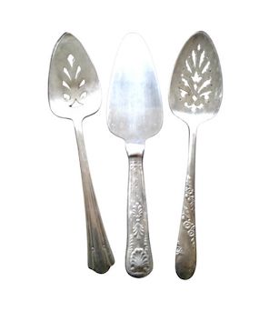 Description: Assorted antique silver pie servers for your dessert buffet. They coordinate with our Heirloom Silver Flatware collection. Rented by the piece. Specify quantity desired.