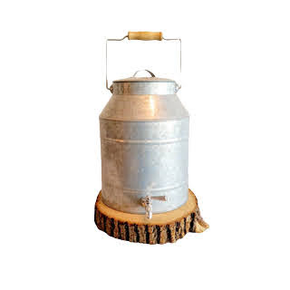 Description: A galvanized drink dispenser with a bit of rustic charm. Use to serve welcome drinks or place on the bar for self-serve water. Holds 2.5 gallons. Use wooden rounds to prop it up.